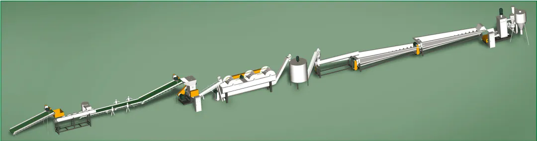 此套生产线有效解决了废旧薄膜(农膜、地膜、包装膜、垃圾膜等)清洗过程工程量和耗水量偏大的问题,研发了一套专门针对农膜地膜类泥沙含量高的破碎清洗处理线,很大程度的提高了产能,降低了水耗和电耗。整套设备从拆包到粗碎-除沙-细碎-清洗-脱水-造粒均可全自动化流水生产,生产出来的成品颗粒基本达到了新料的品质,广泛用于吹膜、注塑挤出、回收造粒等领域。