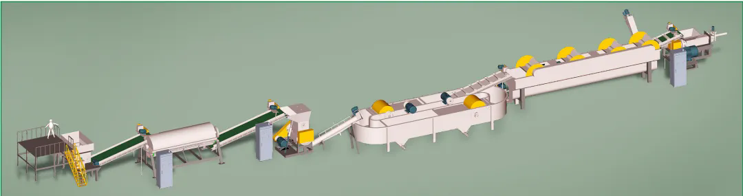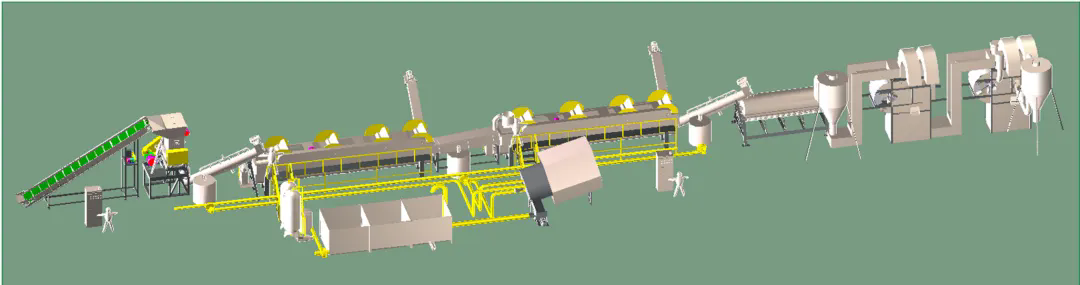 PET瓶清洗回收生产线又称PET塑料瓶破碎清洗回收生产线,聚酯瓶回收流水线,宝特瓶粉碎清洗干燥回收生产线,适用于废旧PET瓶(如矿泉水、可乐等各类塑料瓶)的去标,破碎,清洗,干燥,包装的整套生产设备,废旧PET塑料瓶加工成聚酯瓶片的整套处理方案,将废旧PET塑料瓶加工成可再生利用的高品质PET瓶片。